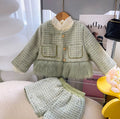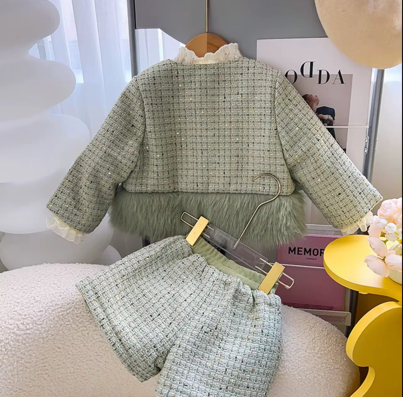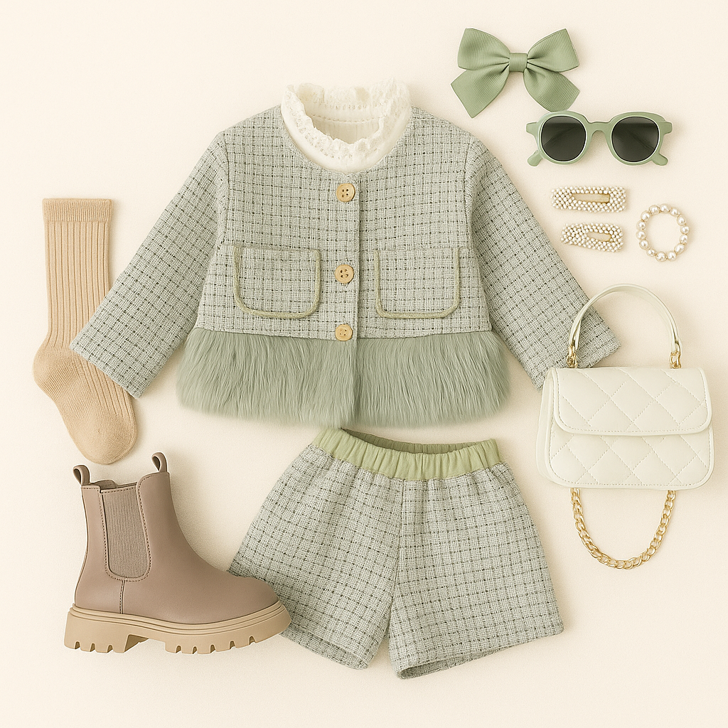 Level up your mini’s fall wardrobe with our Sage Luxe Tweed Set, a modern classic reimagined for stylish little trendsetters. This two-piece short set includes a structured tweed jacket with soft faux fur trim and matching high-waisted shorts, delivering cozy elegance with a playful edge. Complete with gold-tone buttons and a soft inner lining, it’s both comfortable and picture-perfect.